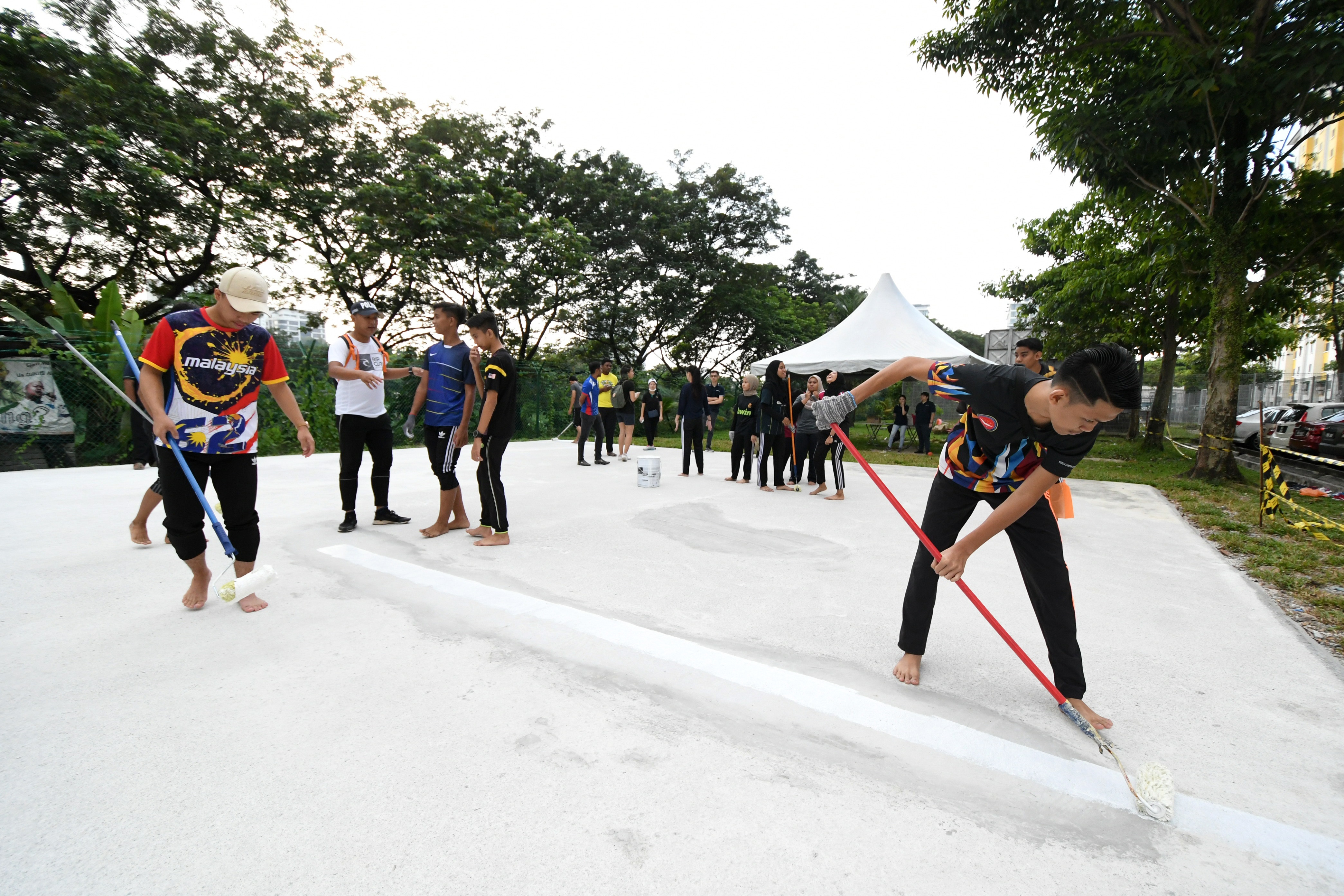 The refurbishment of the outdoor sports court of PPR Seri Cempaka is gaining traction with an increasing number of volunteers participating in the painting works.
