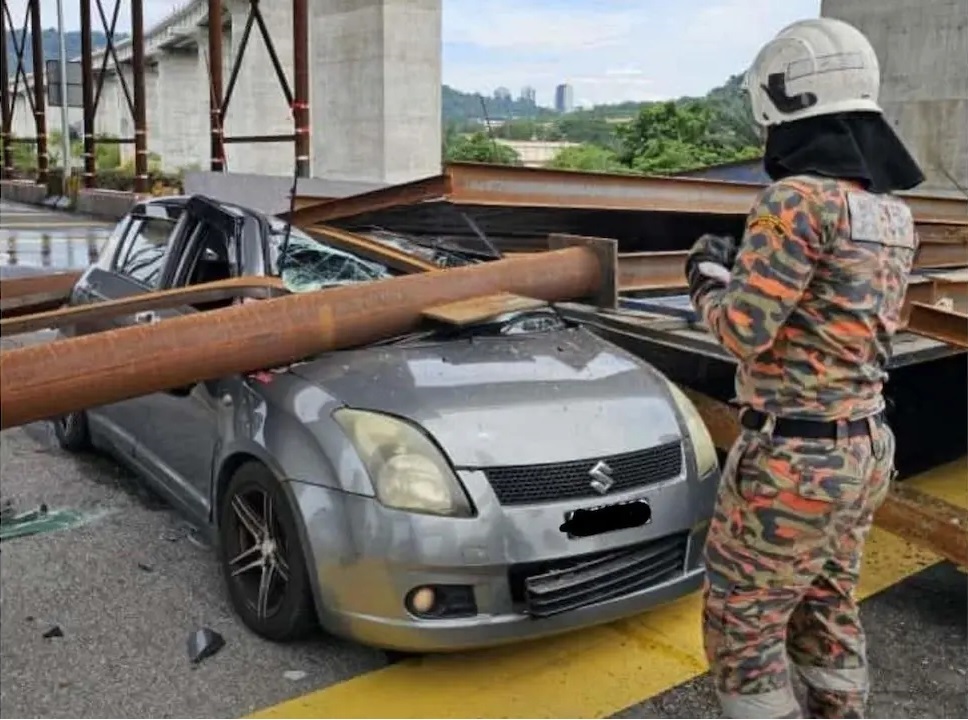 On Tuesday, driver P Gogilavani, 44, had a fright of her life when her car was crushed by a temporary construction structure of the ECRL project at the MRR2 near the Gombak Toll Plaza at about 1.47pm.