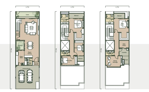 Select units feature double-volume living areas and internal courtyards, which can be converted into additional functional spaces as families grow. Sustainability elements such as solar panels, solar hot water systems, and rainwater harvesting are also incorporated.