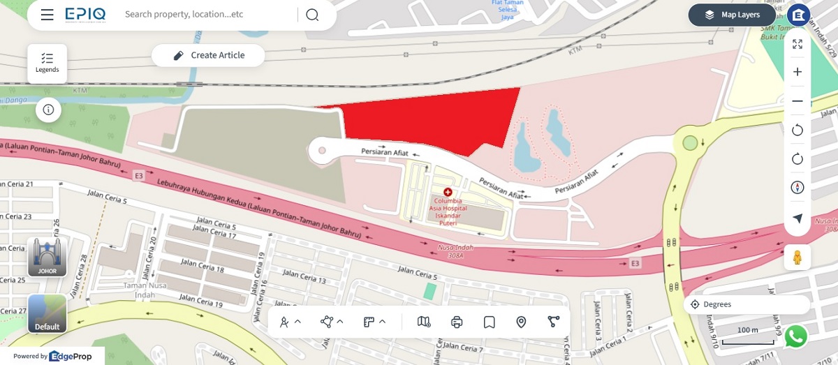 The site lies off the north side of Lebuhraya Hubungan Kedua (Laluan Pontian – Taman Johor Bahru), approximately 14.5km north-west of Johor Bahru city centre, within the Iskandar Puteri locality near the established suburban township of Bukit Indah.