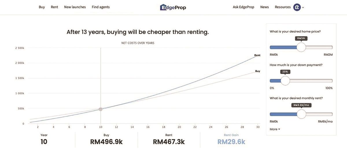 Based on EdgeProp’s calculations of a RM3,000 monthly rent versus a RM1 million property purchase, the monthly installments would become cheaper than the rent from the 13th year onwards (Chart 1).