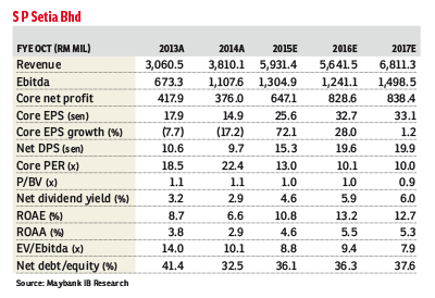 Maintain buy with a target price (TP) of RM4.10: S P Setia is set to enjoy lumpy contributions from its overseas projects (in Australia, Singapore and the United Kingdom) with RM1.5 billion and RM2.3 billion unbilled sales to be recognised progressively in financial year 2015 (FY15) and FY16 respectively.